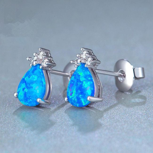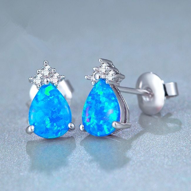 Stylish earrings with smaller artificial stones feature a large blue stone.