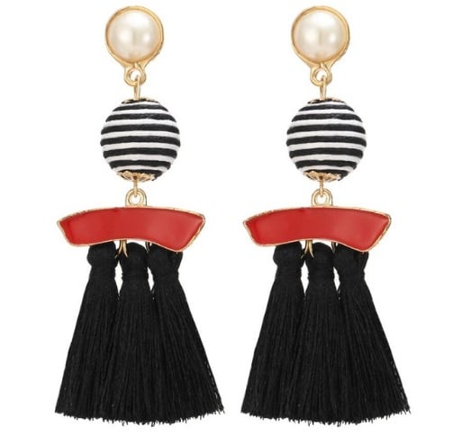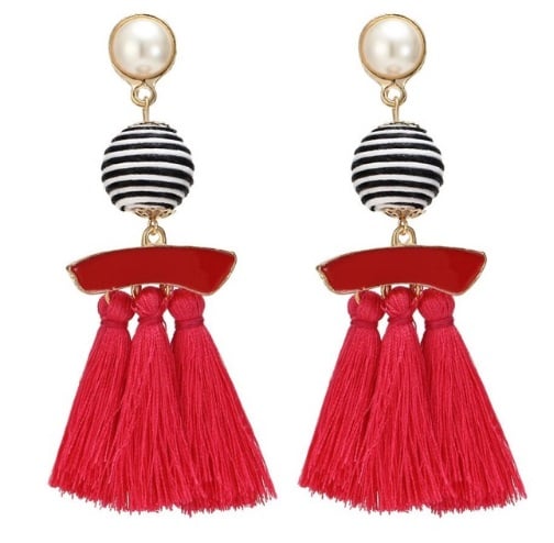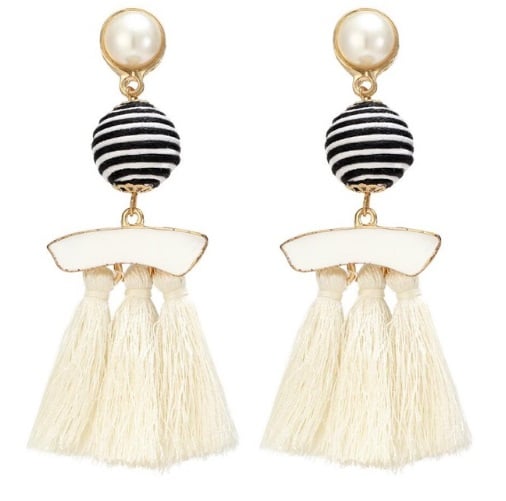 Elegant earrings with a pearl, a bead, and fringes are suitable as an accessory to dresses.