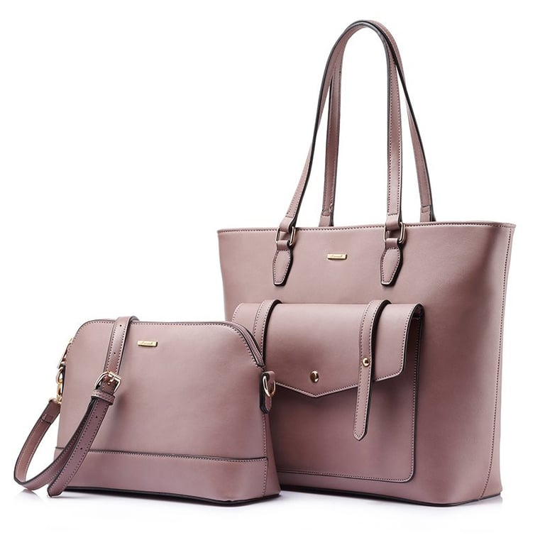 Set of two handbags in an elegant design with gold hardware. The set includes a large handbag for carrying by hand or over the shoulder with a large handle, and a smaller handbag with a long shoulder strap. Available in several colour options.
