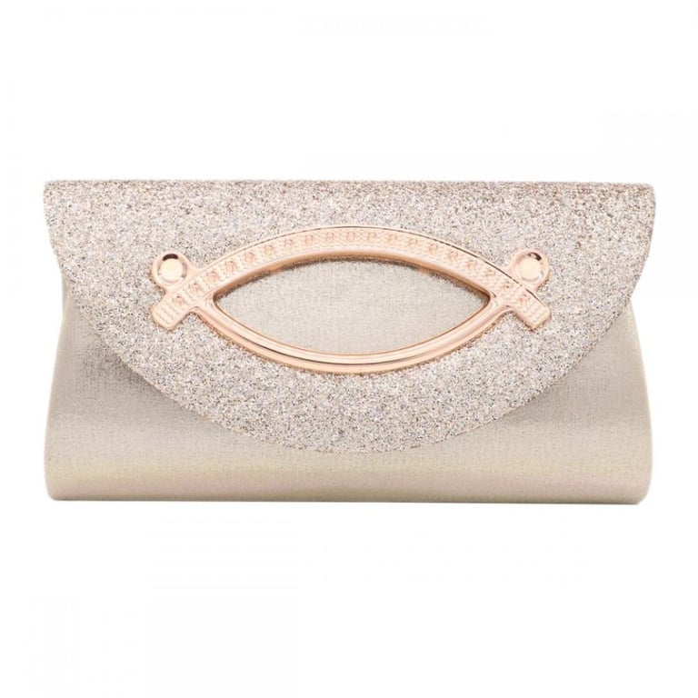 An elegant modern ball clutch adorned with an interesting metallic element featuring gemstones.