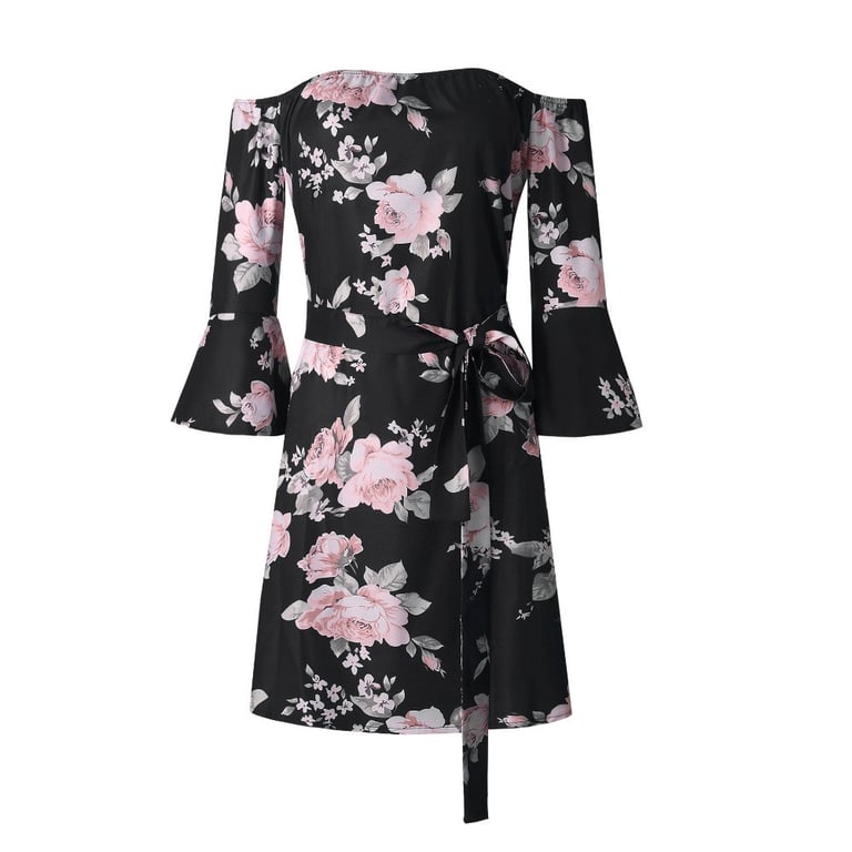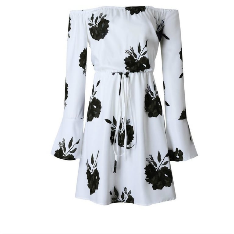 Romantic mini dress with exposed shoulders.