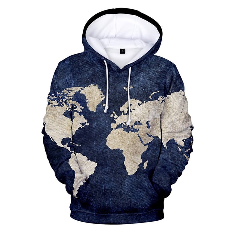 Attractive hoodie with a globe print. The cut is classic with a hood.