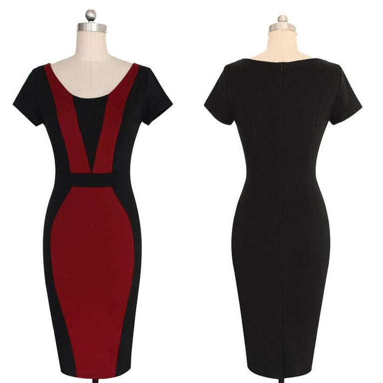 Women's evening dress in an elegant design combining two colours. The dress features a fitted silhouette, short sleeves, and a round neckline. Available in several variations.