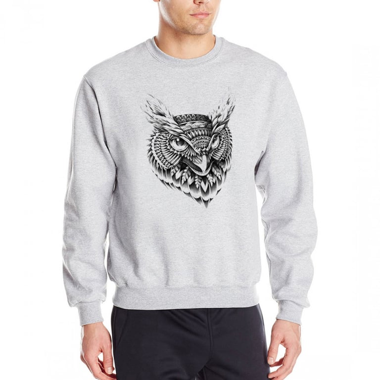 Men's basic pullover sweatshirt. The sweatshirt has a loose fit with an elastic waistband, long sleeves, and a round neckline. It is a solid colour with a print on the front.