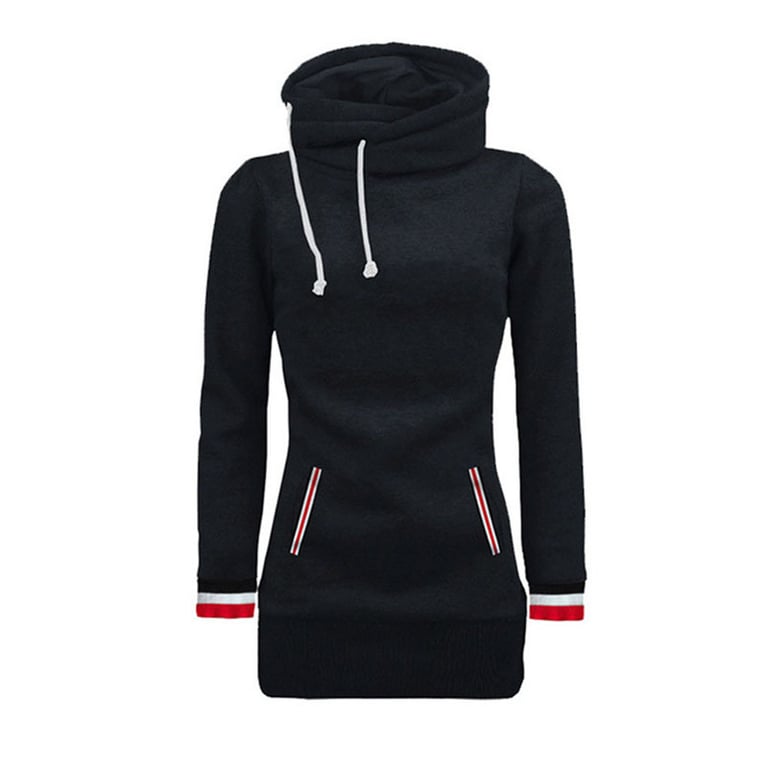 Women's hoodie with a hood and collar. The hoodie has a long fitted cut with side pockets. Available in multiple colour options.