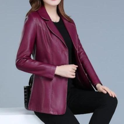 Women's longer leather jacket in various colours.