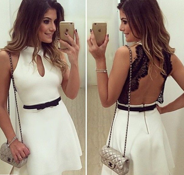 Evening ball gown with lace at the neckline.