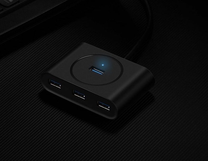 The hub features a stylish design and LED indicators showing which ports you are currently using.