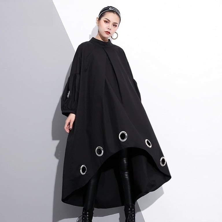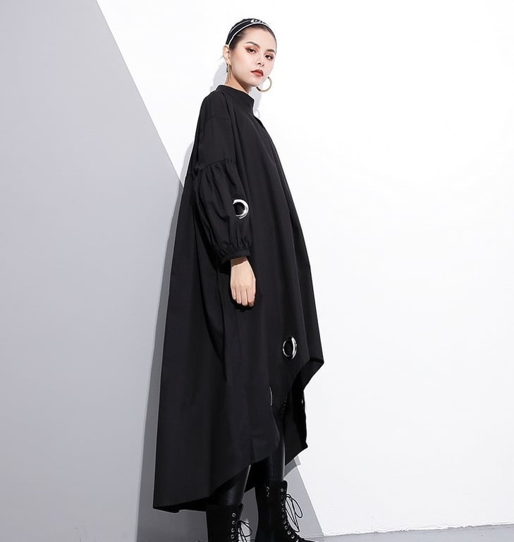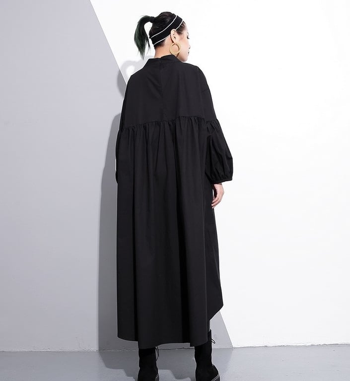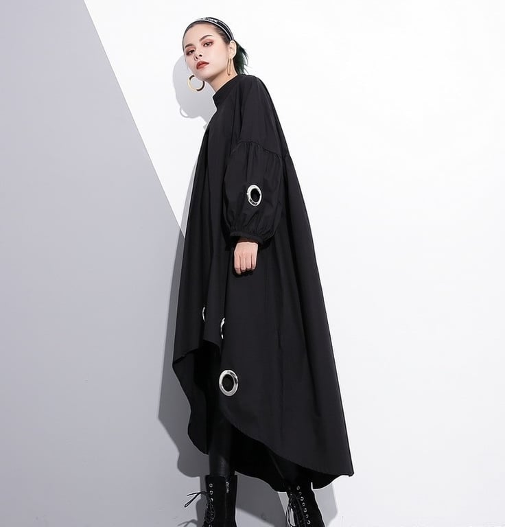 Original black maxi dress with a wide flared skirt and metallic embellishments.