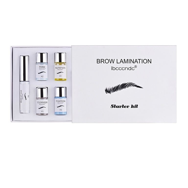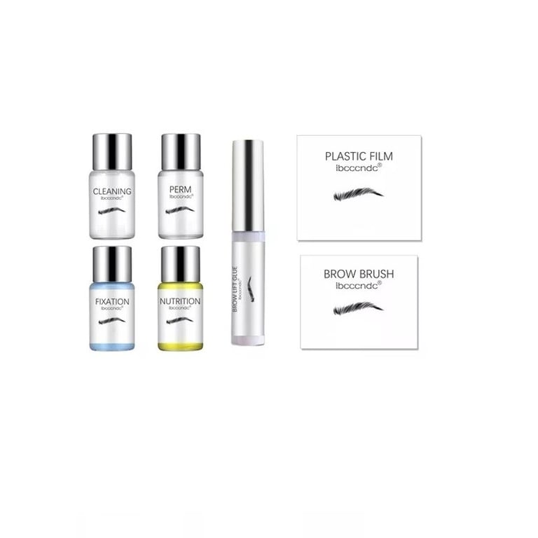 Contents of the package: 1x adhesive film, 1x brow lifting brush, 1x 5 ml cleaning solution, 1x 5 ml setting lotion for perming, 1x 5 ml fixing milk, 1x 5 ml nourishing milk, 1x 7 ml adhesive for brow lamination to fix the hairs