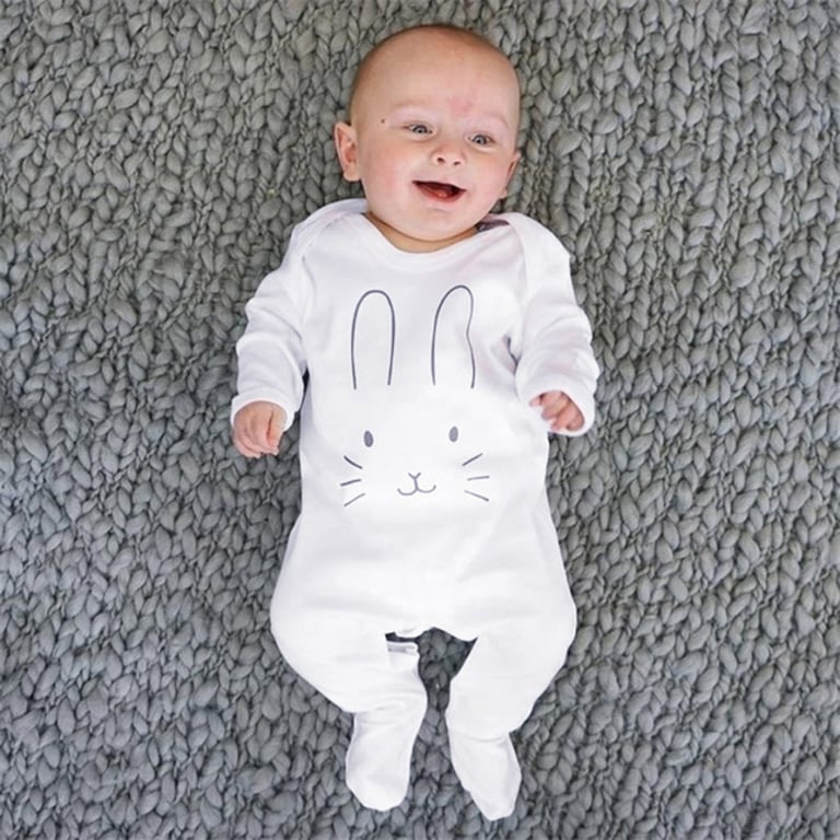 Children's bodysuit with dungarees. Fastens with snaps. Long sleeves and legs. Colourful print featuring a bunny. Available in multiple colour variants.