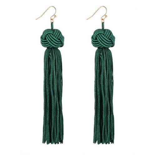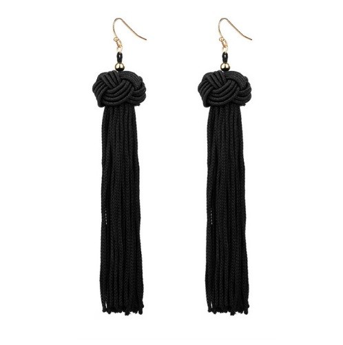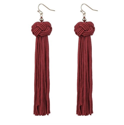Modern knot-shaped earrings with fringes are a suitable accessory for dresses, skirts, and shorts.