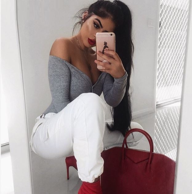 Fashionable stylish women's sexy bodysuit with off-the-shoulder sleeves.
