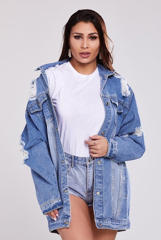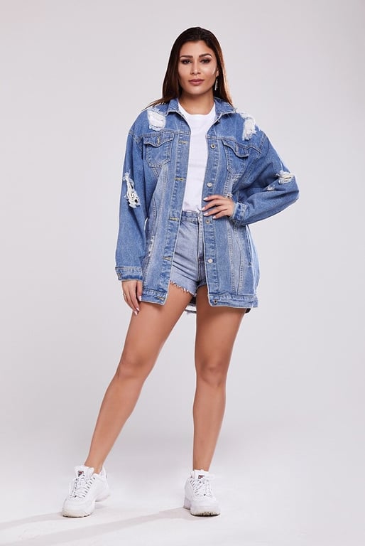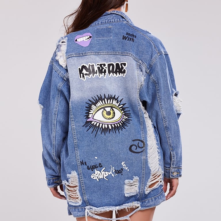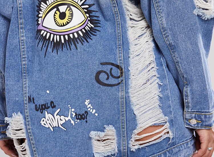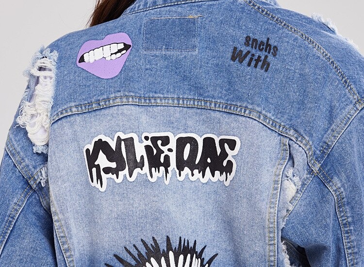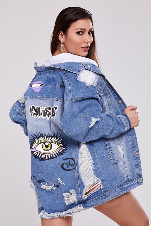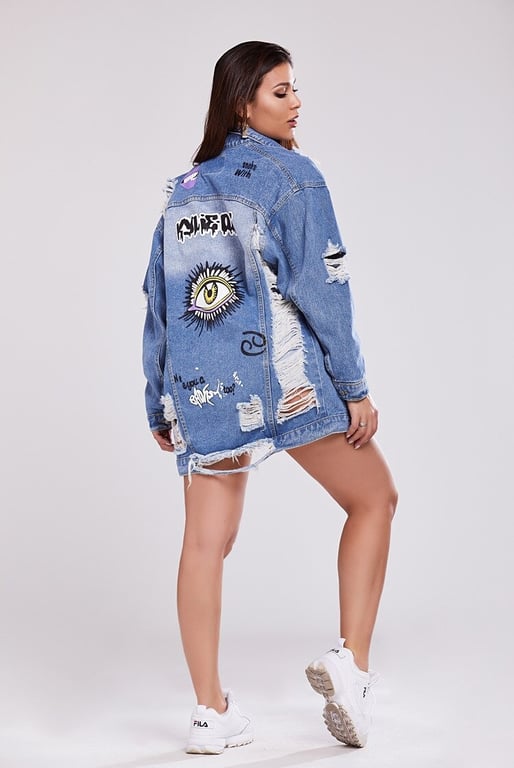 • Cool women's denim jacket with a distressed pattern and stylish prints. Step out in style and reach for this trendy denim jacket piece.