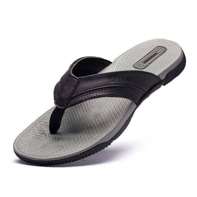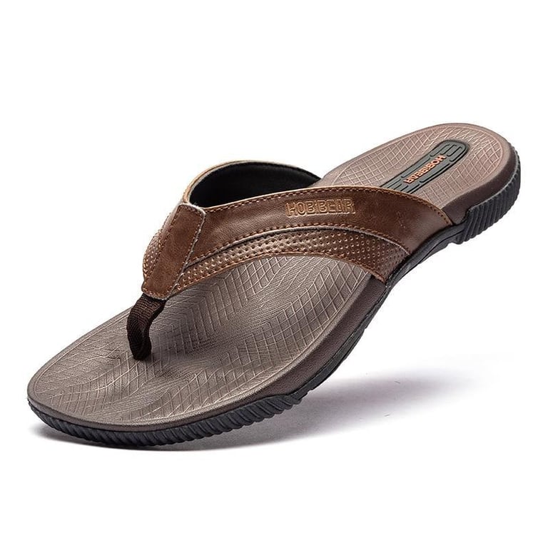 Men's modern flip-flops made of synthetic leather. Available in brown or black.