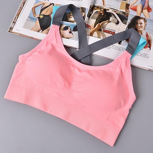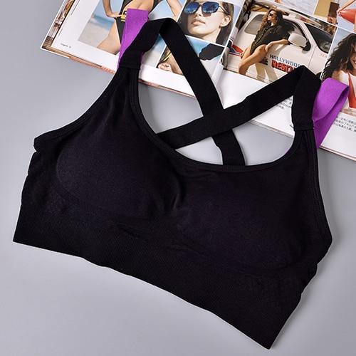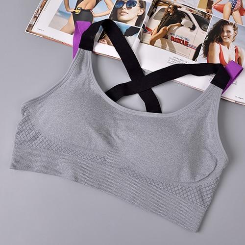 Sports bra made of spandex and nylon. Beautiful design with crossed straps. Suitable for running or fitness sports.