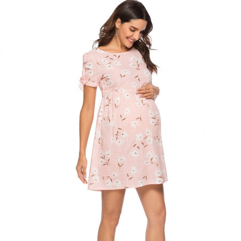 Women's maternity dress with short sleeves. Loose short cut with a tie belt at the waist. Colourful floral print.