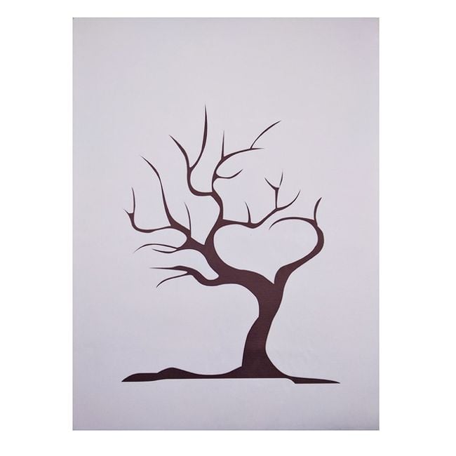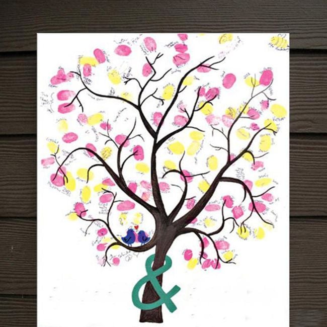The image depicts a tree and is suitable for a wedding so that each guest can "imprint" and sign with their fingers.