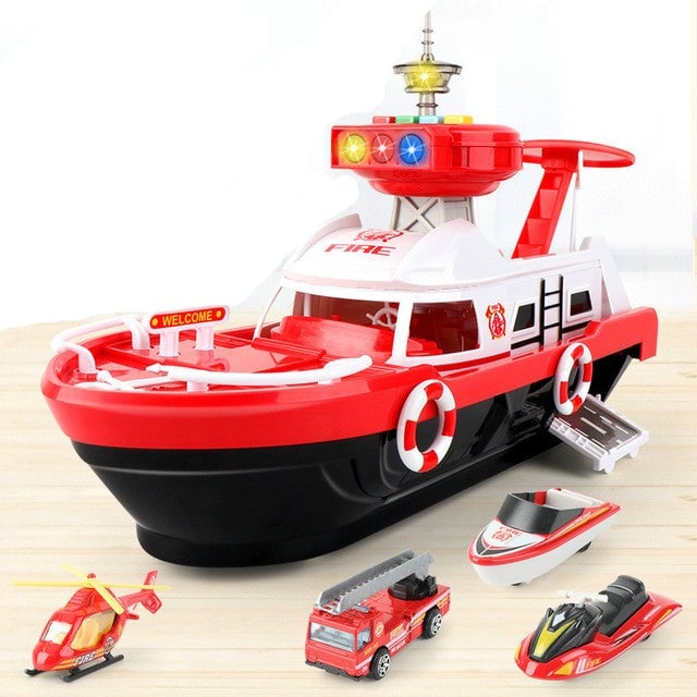 Fireboat with a set of toy cars that you can park in the boat.