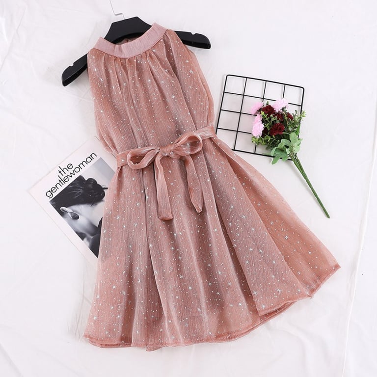 Women's short dress with a sparkling surface. The dress is sleeveless with straps and features a loose gathered skirt and a tie at the waist. Available in several colours.