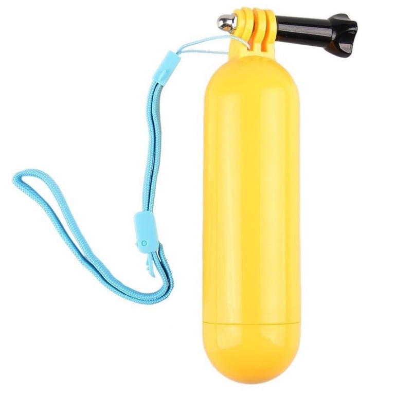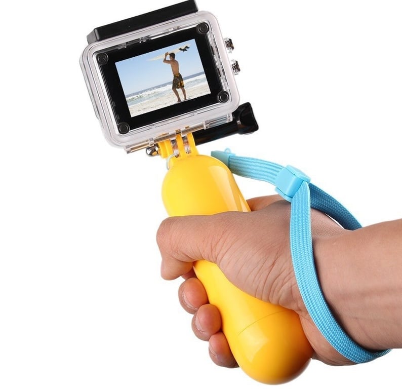 A floating mount for sports cameras and cameras with a wrist strap, amazing for use in water sports.