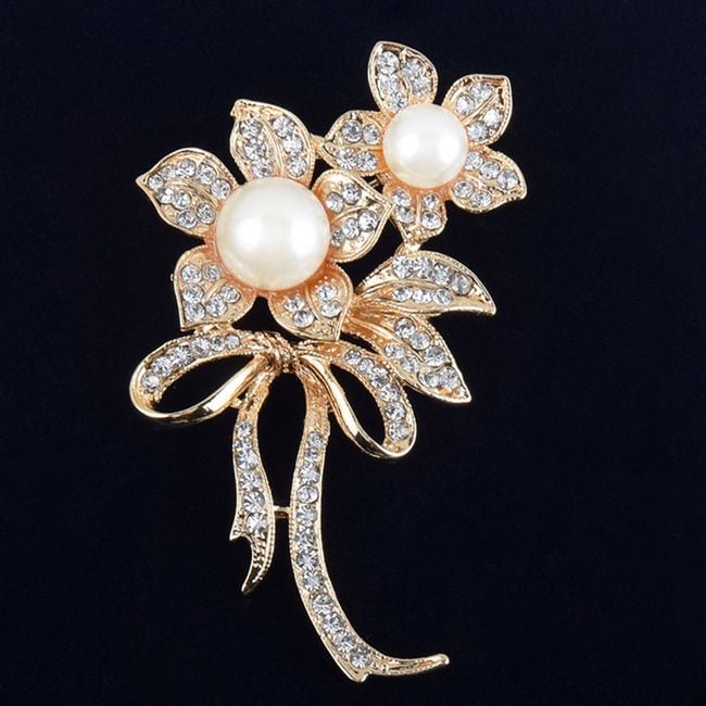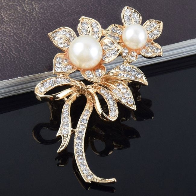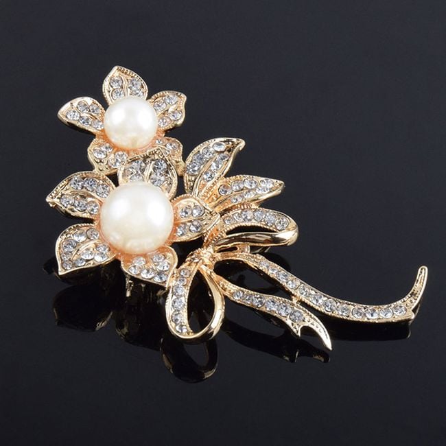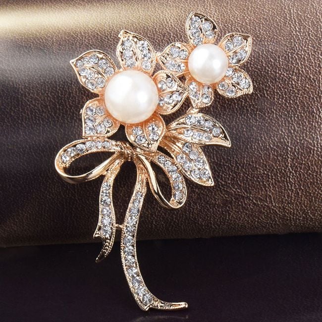Elegant floral brooch with costume jewellery stones and an artificial pearl.