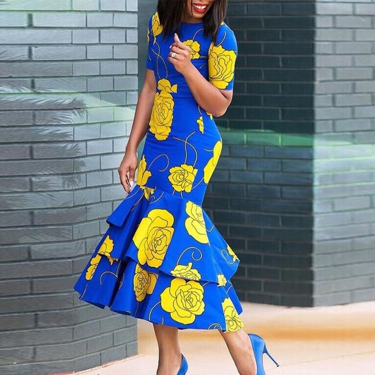 Beautiful stretchy long dress with a rich ruffled skirt.