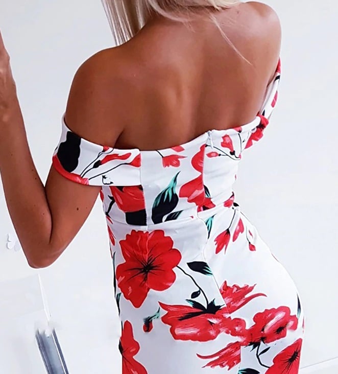 Women's evening fitted dress with a delicate floral pattern. The dress is white with a red floral design. It features romantically exposed shoulders and beautifully shapes the figure.