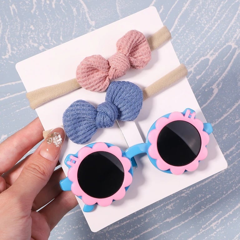 . These children's sunglasses are also the perfect accessory to give your child style. The flower part with the lens can be flipped up. Comes with a bow on an elastic band in two pieces, which little girls will surely appreciate.