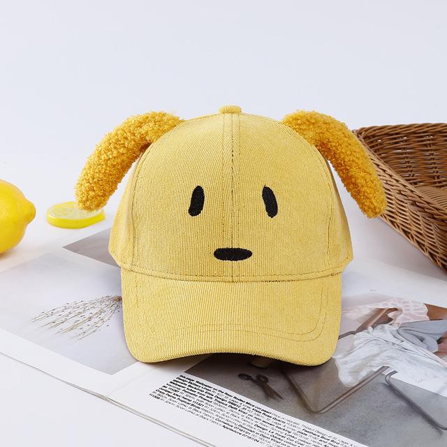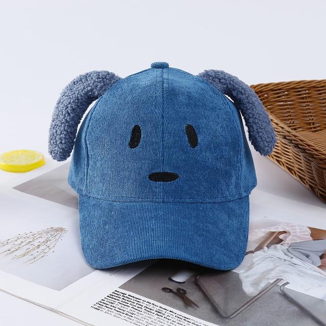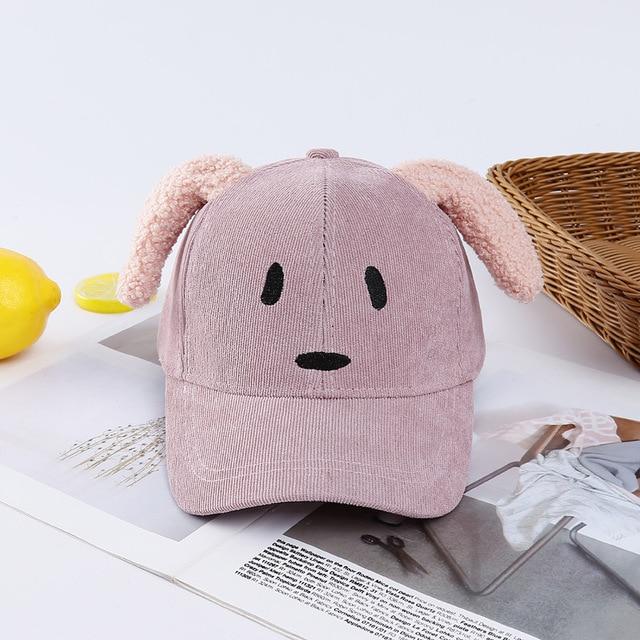 Funny children's cap featuring a dog design. The front is embroidered with a snout and eyes. The top is adorned with ears.
