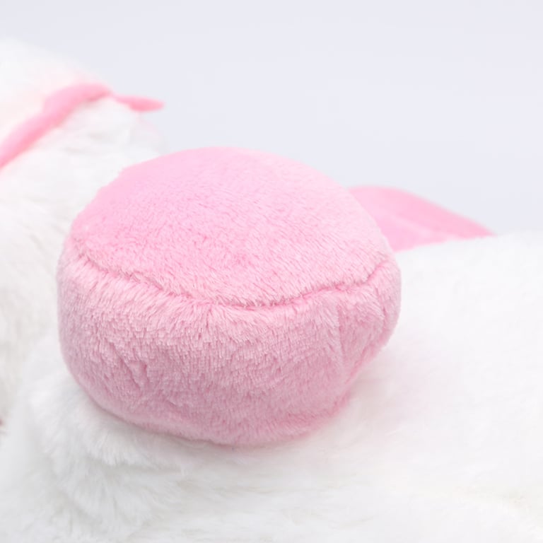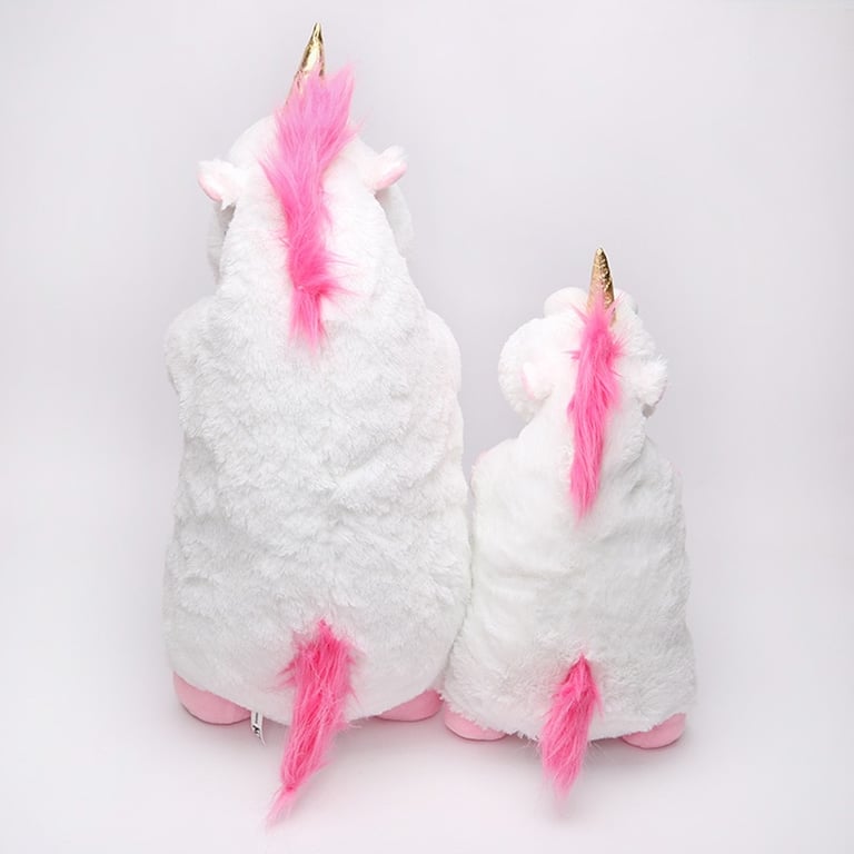 This plush unicorn is available in several sizes. It is entirely white, with a pink mane and hooves, and a golden horn.
