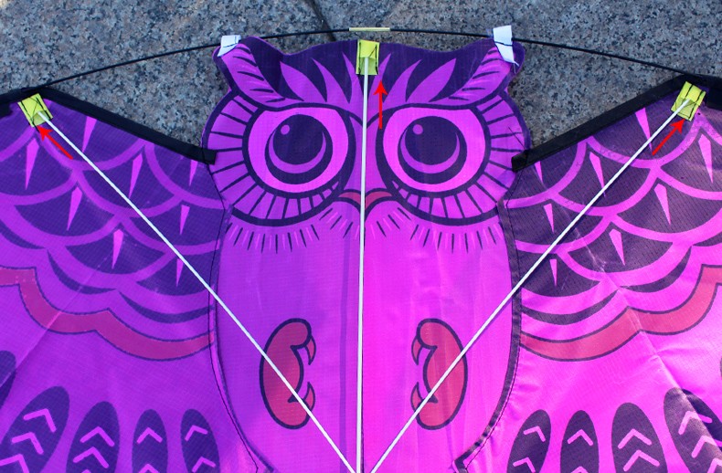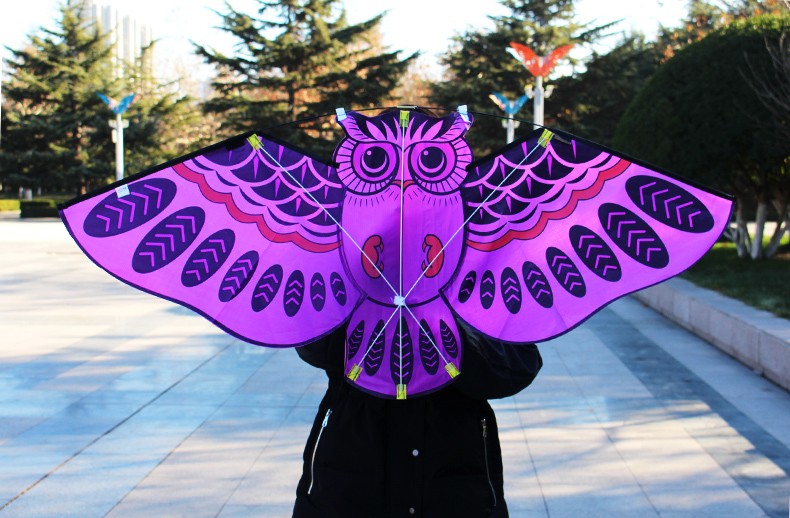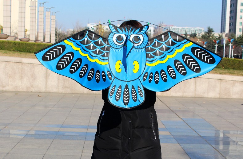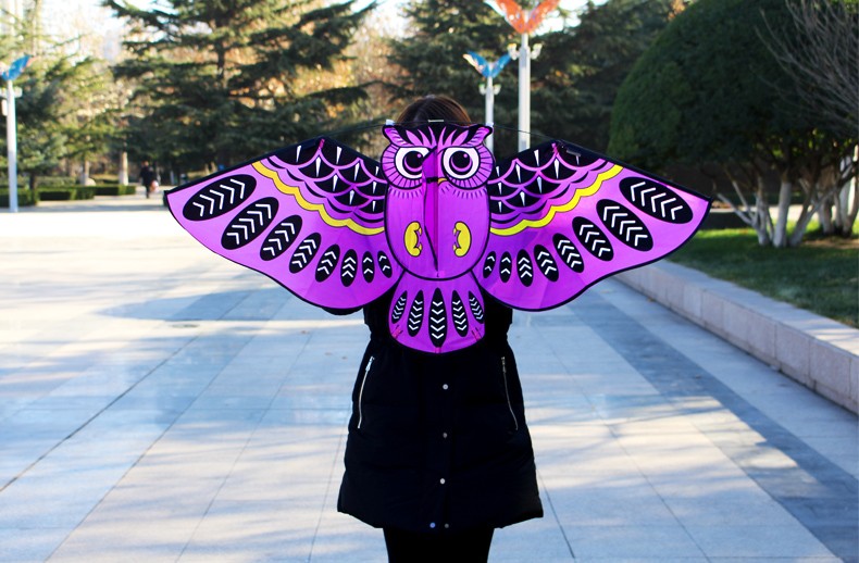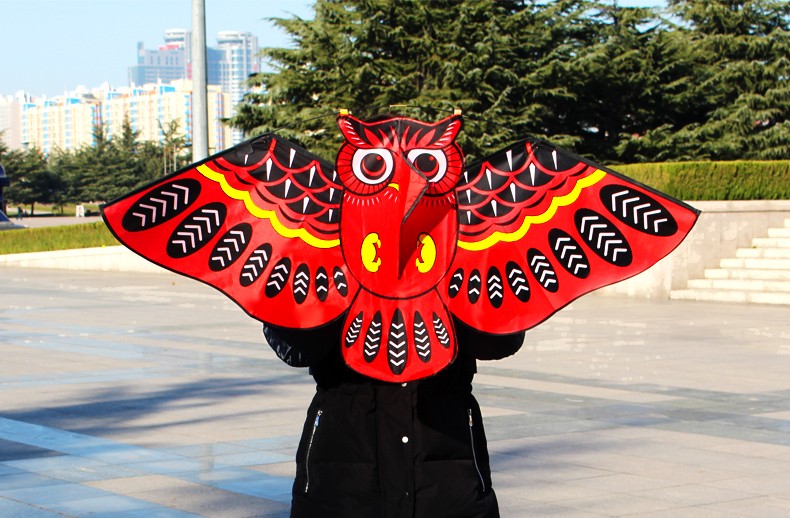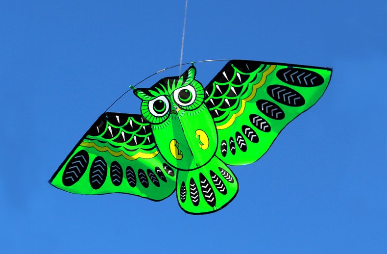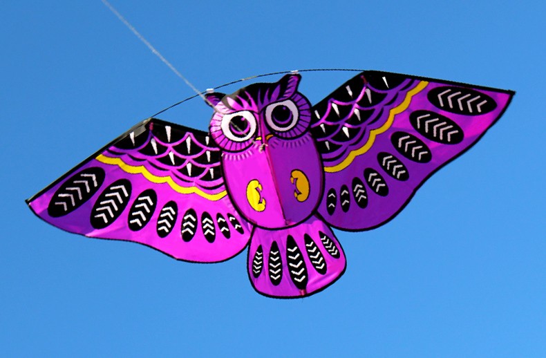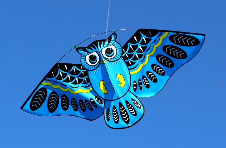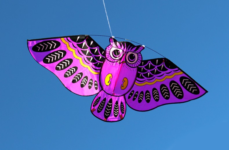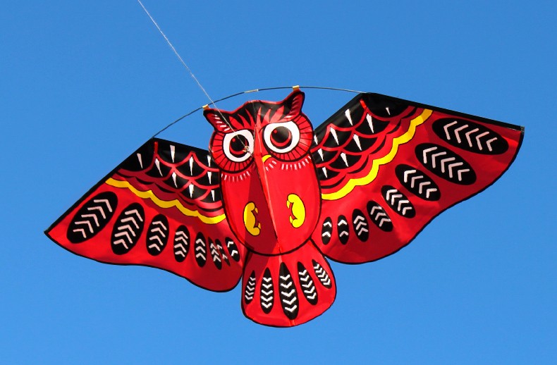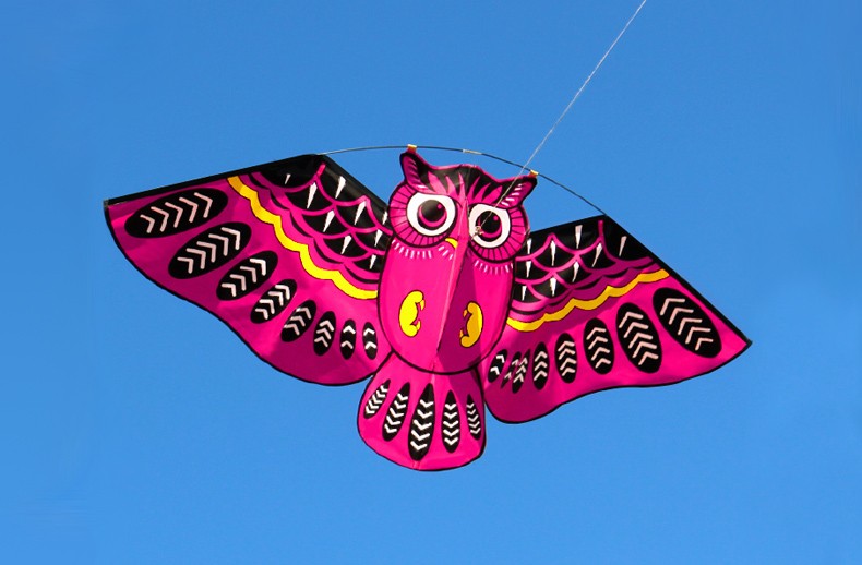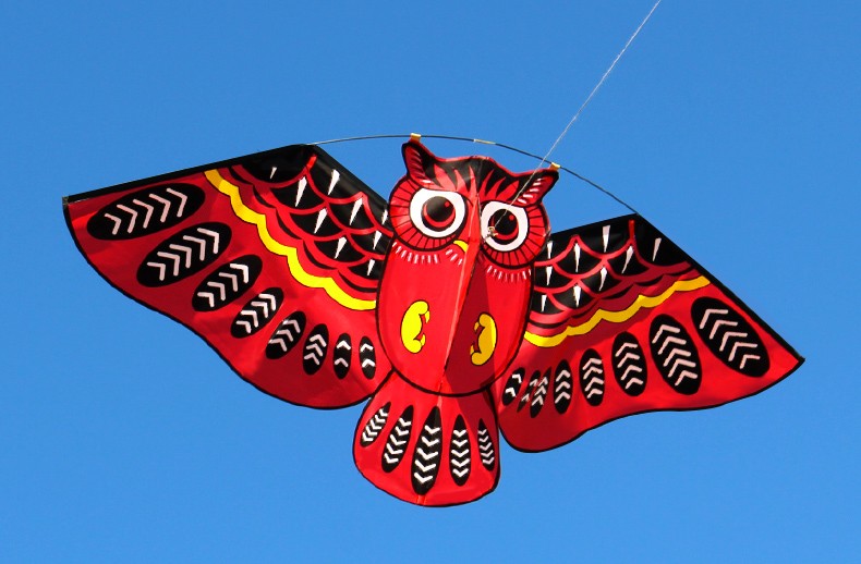 Flying kite with an owl pattern.