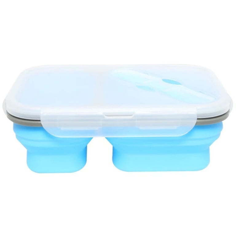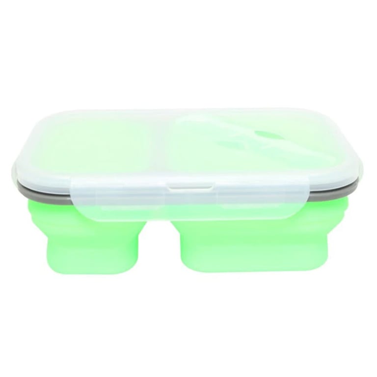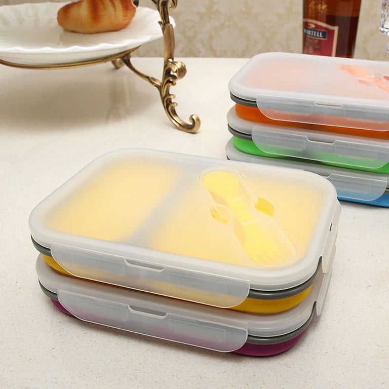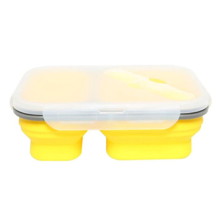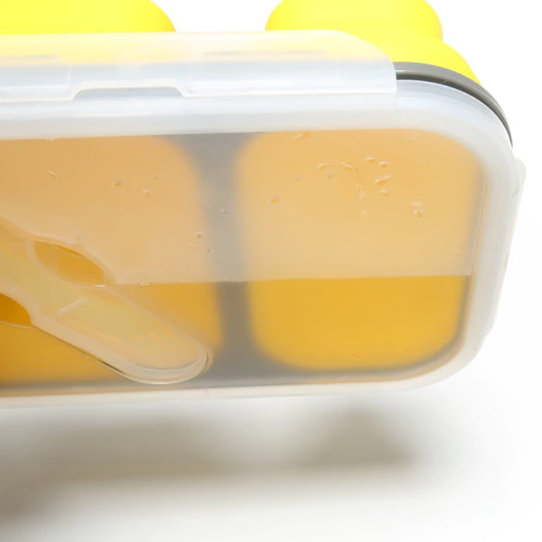 Practical silicone box with two compartments, a lid, and cutlery. Take your favourite meal to work conveniently and waste-free.