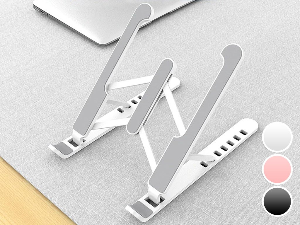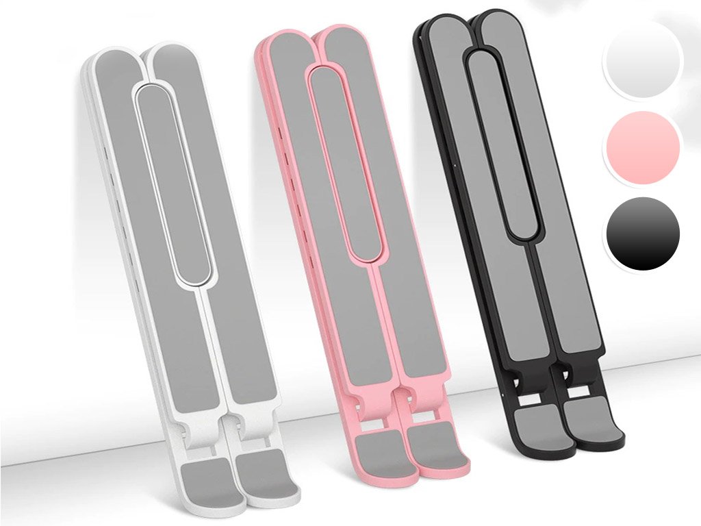 A practical foldable stand for MacBook, iPad, and other laptops or tablets up to 15.6". Quality is guaranteed by a sturdy aluminium construction with non-slip pads. Available in three colours.