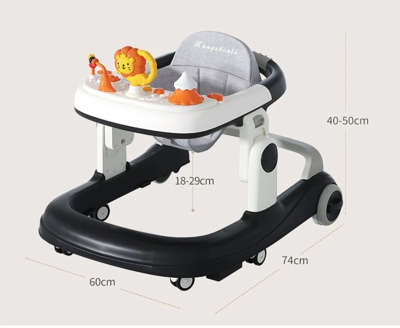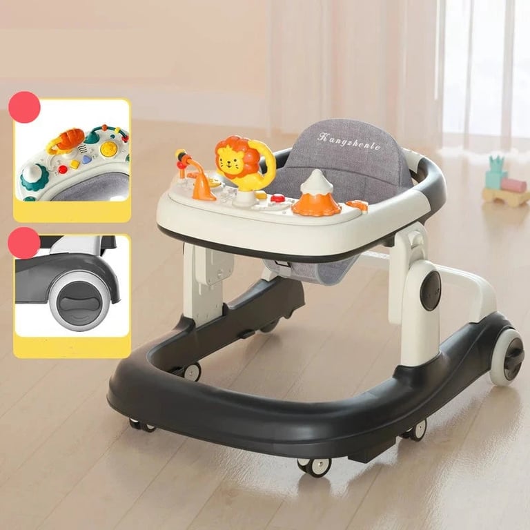 Folding baby walker with removable dining and musical tray is ideal for children aged 6 to 18 months. It provides a safe environment for first steps and fun thanks to interactive toys and music. The walker features adjustable height, a softly padded seat, and folds easily for space-saving storage or travel. High-quality materials and a stable construction ensure comfort and safety during daily use.