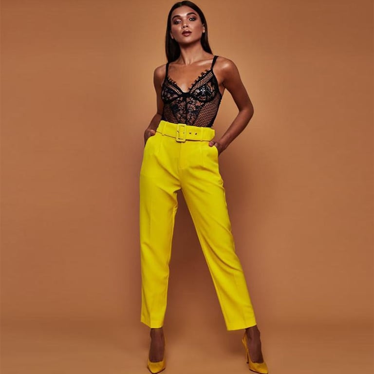 Women's elegant straight-cut formal trousers. The trousers have a high waist with a wide belt. Two side pockets. Available in several variations.