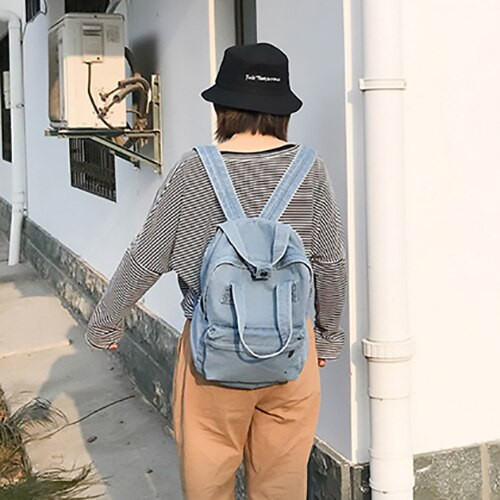 Denim backpack with adjustable straps and a handle. Large pocket with a zip closure and a small front pocket. Available in two variants.