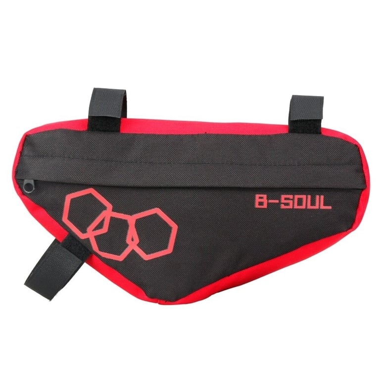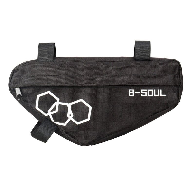 A cycling bag that is suitable for example for a phone, wallet or keys. It attaches to the top frame of the bike using Velcro. It holds well and does not obstruct. It is made from high-quality material.