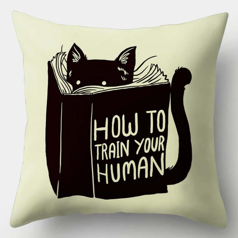 A funny cushion featuring a cat studying the guide “How to Train Your Human”, suitable not only for cat lovers. Choose from many designs we have prepared for you.