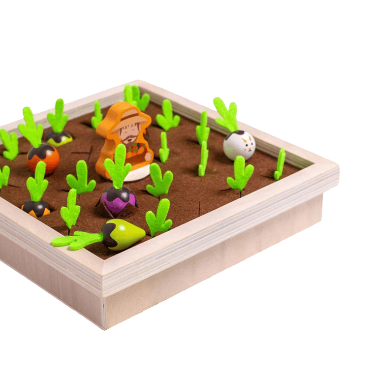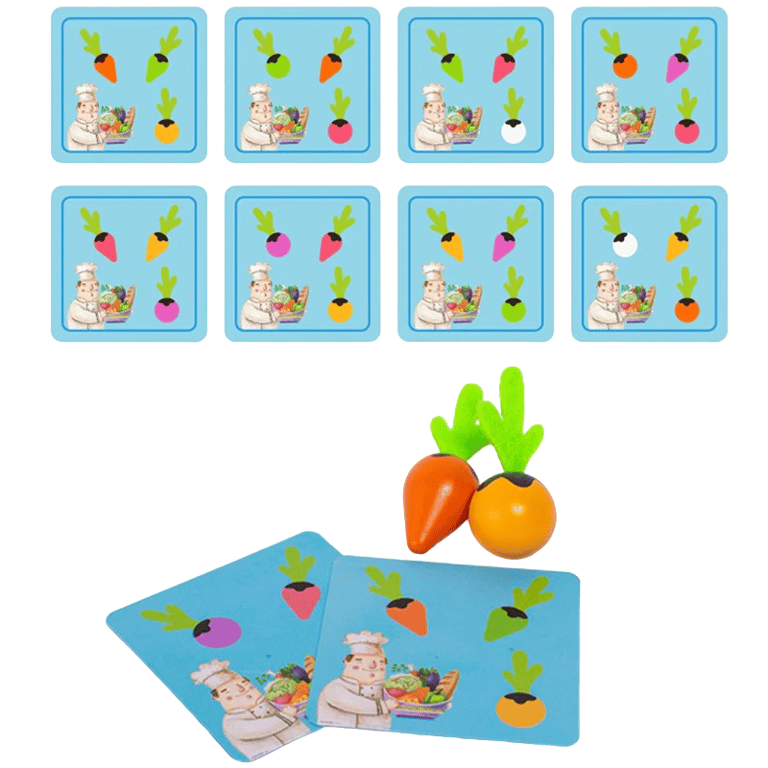 The Garden Harvest Game is a memory and reaction game that trains memory and quick thinking. The game includes 24 pieces of vegetables and 8 recipe cards. The aim of the game is to harvest the produce from the garden according to the recipe cards.