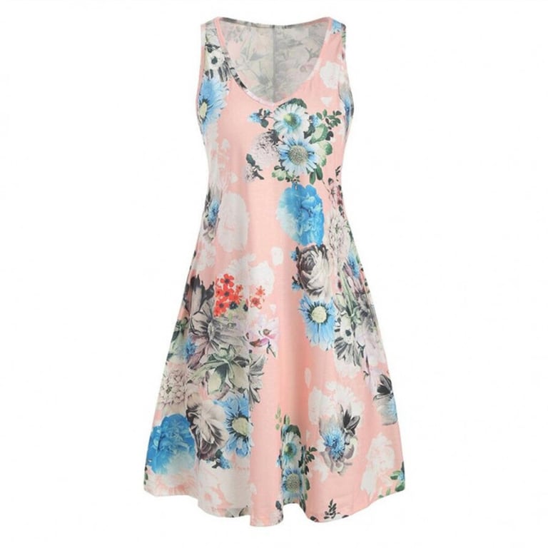 Women's sleeveless summer dress. A-line skirt and fitted waist. Round neckline. Printed with a colourful pattern. Available in multiple variants.