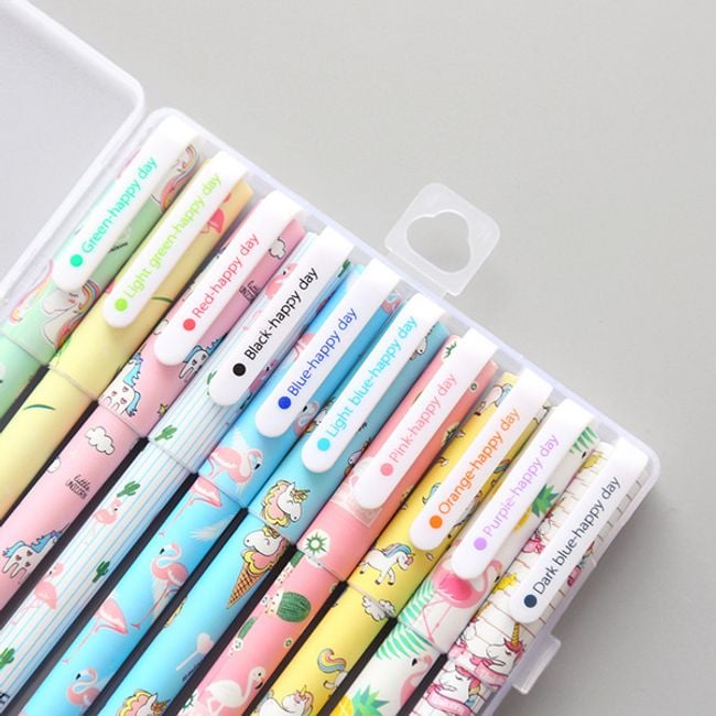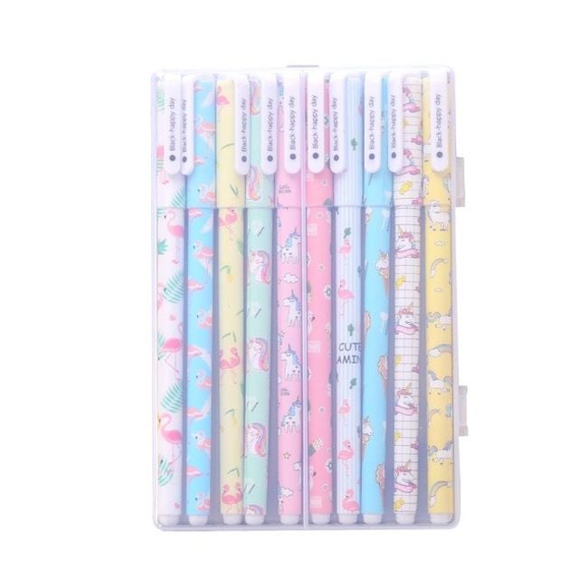Gel pens are decorated with small images of unicorns. You can choose between the black ink variant and the one with various coloured inks.