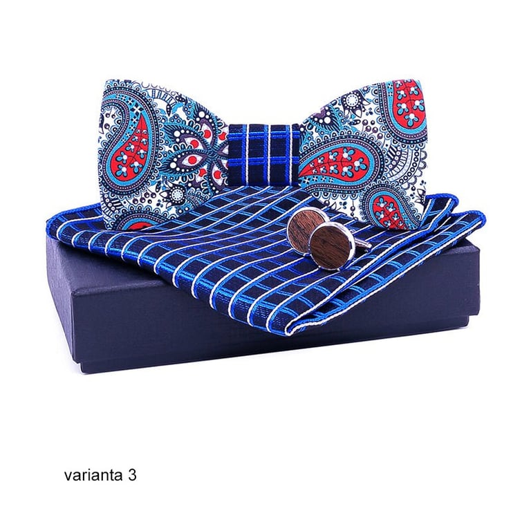 A stylish set for social events for every gentleman. Choose the variant that suits you best. In the package, you will receive a wooden bow tie, a pair of cufflinks, and a stylish pocket square.