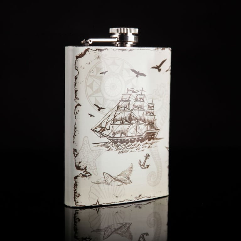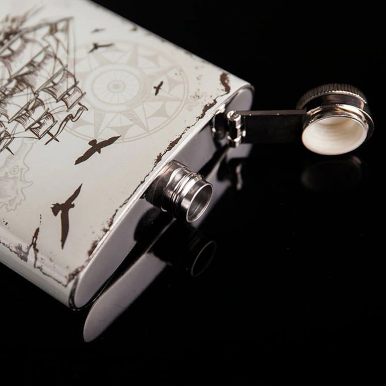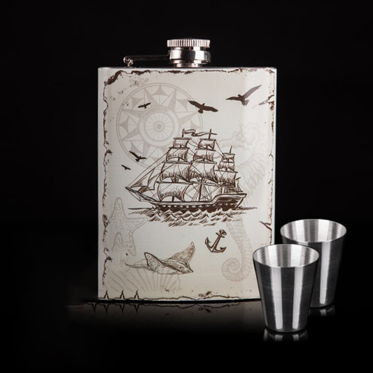 Stylish flask featuring a travel ship design. Two shot glasses will come in handy on your journeys when you want to enjoy a drink. Product features: