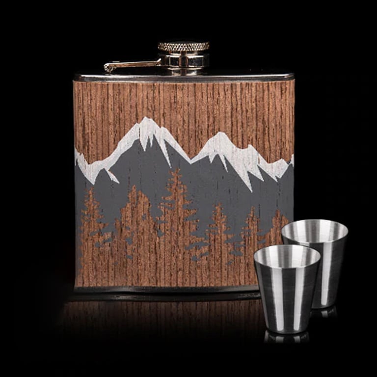 A hip flask featuring a high mountain design for all travellers. Two shots are perfect for enjoying a drink in your favourite locations.
