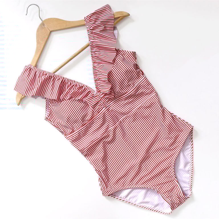 Women's one-piece swimsuit with a striped pattern. Straps and neckline adorned with ruffles. Available in multiple colour options.