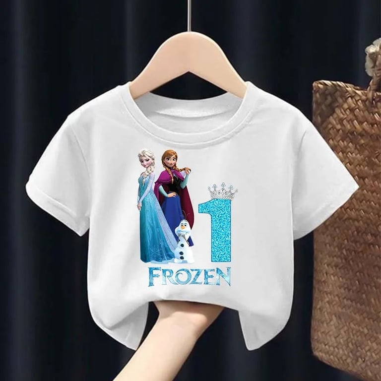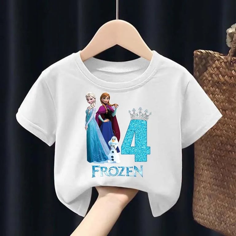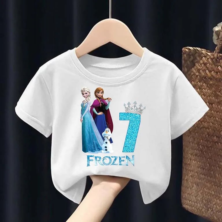 Girls' birthday T-shirt with the Frozen number. Material: 50% cotton, 50% polyester Size chart (cm) Size 100 — T-shirt length 43 cm — Chest circumference 60 cm Size 110 — T-shirt length 45 cm — Chest circumference 62 cm Size 120 — T-shirt length 47 cm — Chest circumference 66 cm Size 130 — T-shirt length 50 cm — Chest circumference 68 cm Size 140 — T-shirt length 53 cm — Chest circumference 72 cm Size 150 — T-shirt length 56 cm — Chest circumference 76 cm Size 160 — T-shirt length 59 cm — Chest circumference 84 cm
