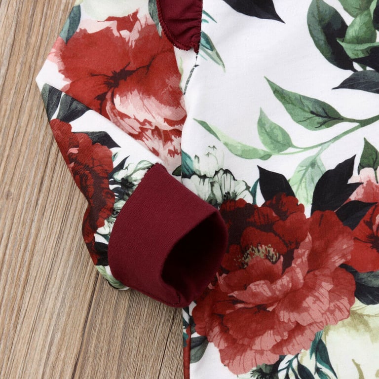 It features a beautiful floral pattern and ruffles on the shoulders.