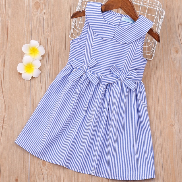The dress is sleeveless, features bows and a collar. The print is striped.