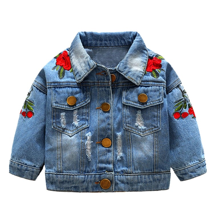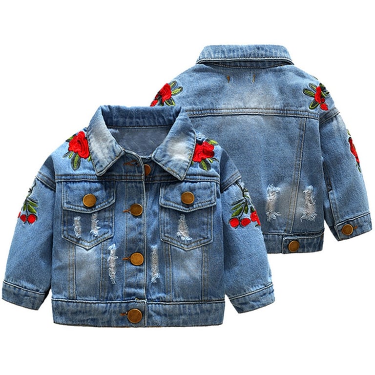 Featuring a cute flower embroidery on the shoulders and sleeves, with a modern distressed design.
